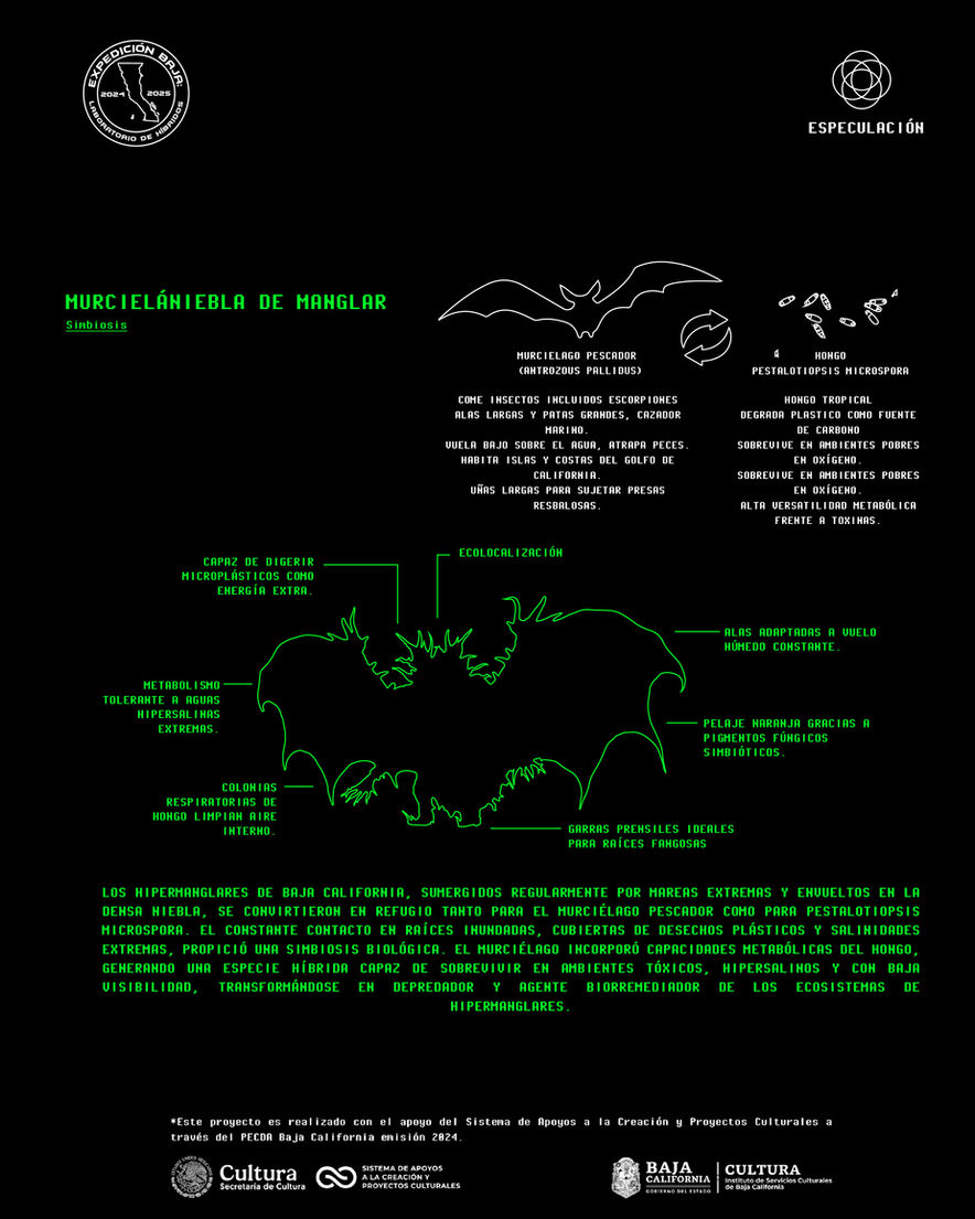 Expedición Baja: Laboratorio de híbridos es un proyecto de arte especulativo que se sitúa en la intersección entre la ciencia, la tecnología y la imaginación creativa. Las especies híbridas, ambientes y ecosistemas aquí presentados no corresponden a organismos reales ni a procesos científicos actualmente comprobados, sino que son construcciones ficcionales basadas en observaciones de la biodiversidad de Baja California, el estudio de especies nativas y endémicas, así como en principios de evolución, adaptación y resistencia.